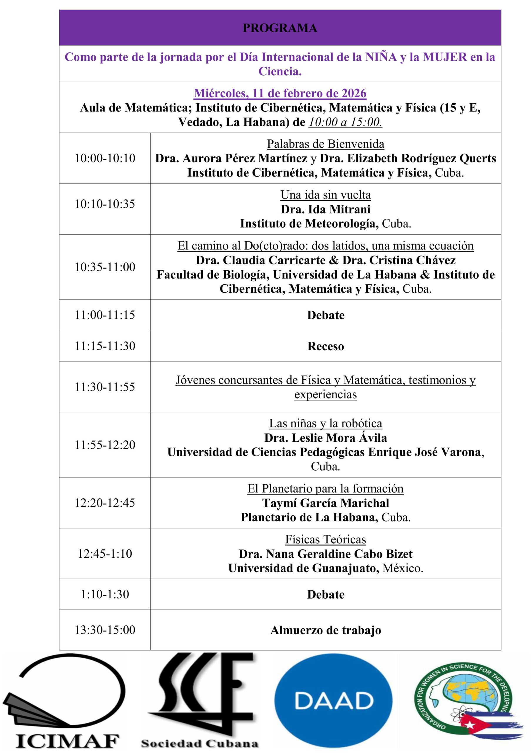 Program Download the Program Program Download the Program Courses & Events Program Download the Program Essay "Envejecimiento y Vejez" by Dr. Zaida Capote Download the essay (Spanish) Program Download the Program Empowering Women in Science Program Program Gallery III Hybrid Workshop in Celebration of the International Day of Women and Girls in Science Program Gallery Dra. Mayda Alvarez Suarez Head of the Center for Women Studies, Cuban Federation of Women (FMC) Intervention of Ambassador of UNESCO in Cuba Lourdes Borrego.